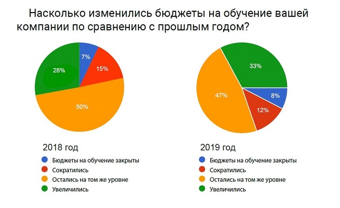 1. Бюджеты на обучение в 47% случаев остались на прежнем уровне, а 33% опрошенных отмечают увеличение бюджетов (против 28% в 2018, 21% в 2017 и 17% в 2016).