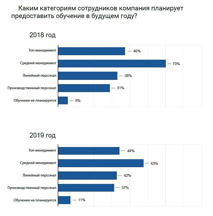 Ответы респондентов свидетельствуют, что у компаний каждый год возрастает интерес к обучению сотрудников: